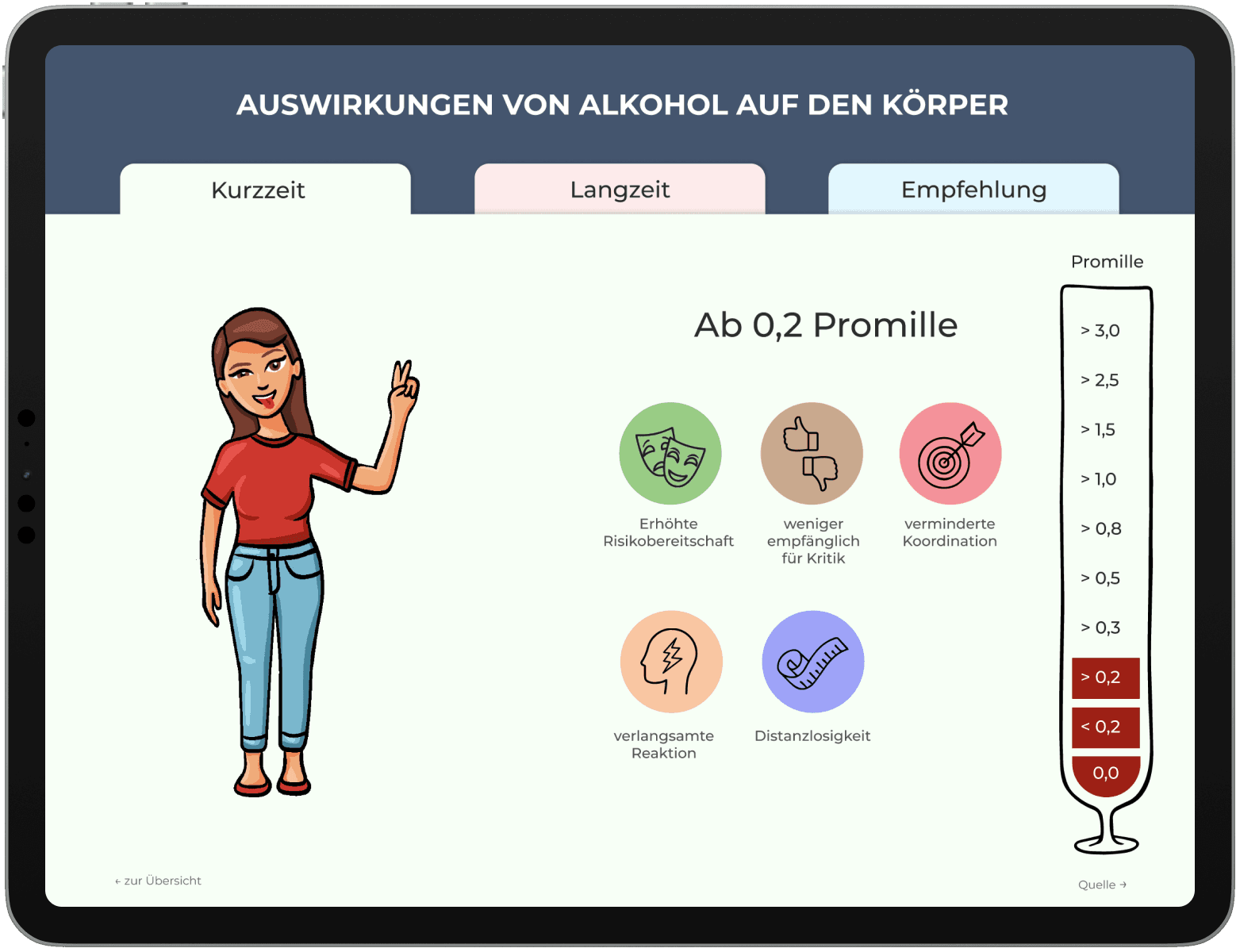 Der Bereich „Kurzzeitauswirkungen“ dient als bewusst niedrigschwelliger Einstieg in die Thematik. Da viele Menschen die unmittelbaren Effekte von Alkohol aus eigener Erfahrung kennen, ermöglicht dieser Abschnitt einen leichten, alltagsnahen Zugang zum Thema, bevor komplexere Langzeitfolgen vertieft werden. Die Promillestufen werden über eine Weinglas-Metapher interaktiv erschlossen: Mit steigendem Füllstand erhöht sich der Promillewert. Eine leicht animierte Figur unterstützt die Identifikation, während klar strukturierte Icons (z. B. Sehen, Koordination, Sprache) die Auswirkungen systematisch ordnen und schnell erfassbar machen.