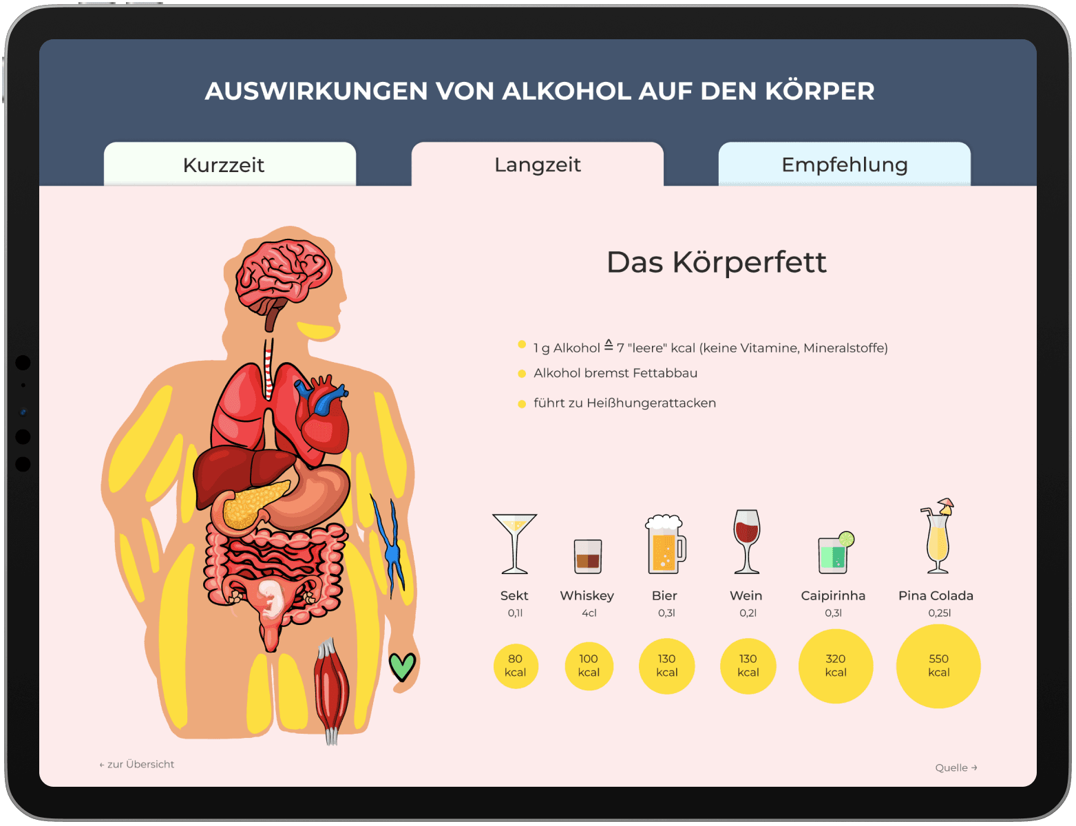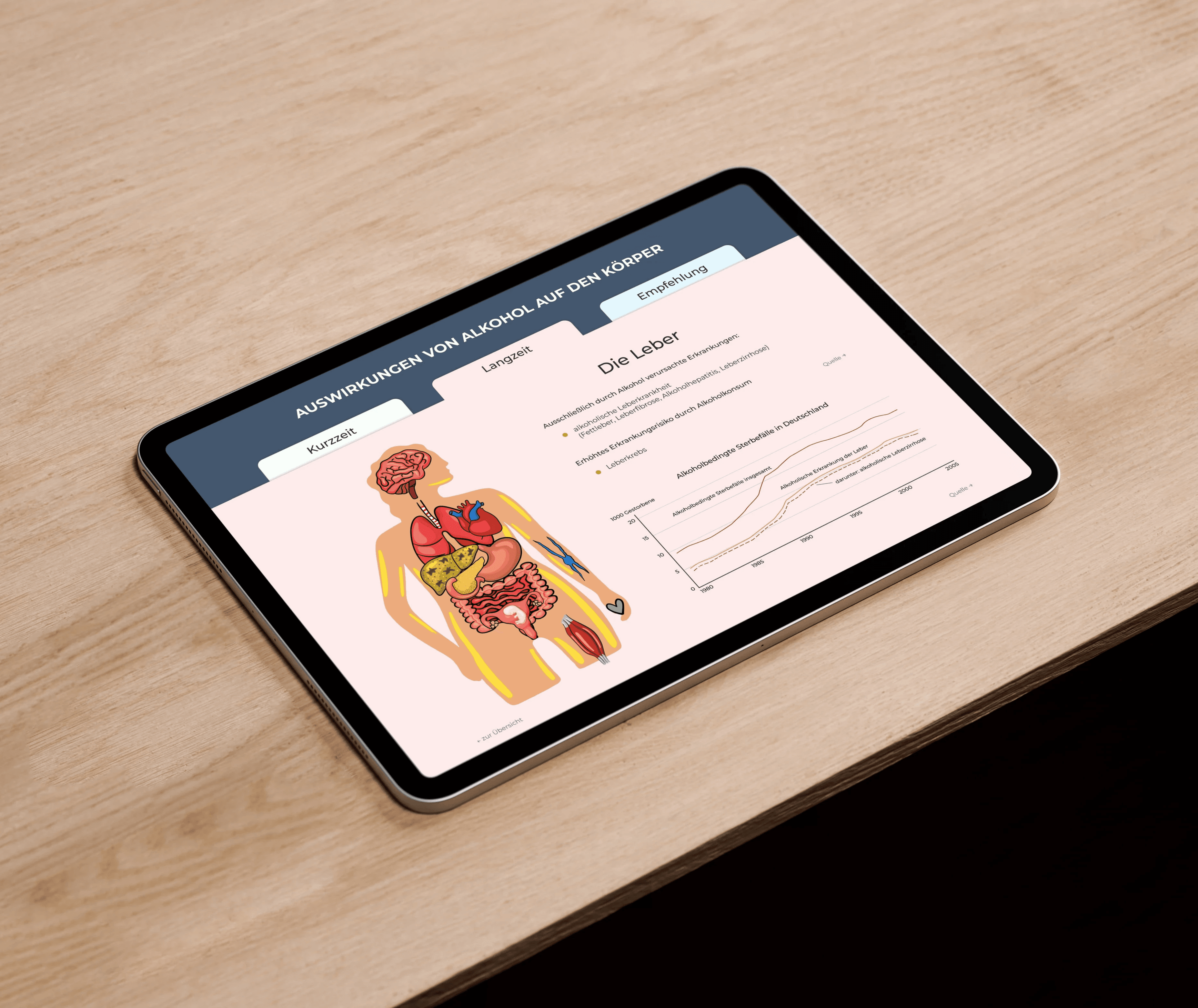 Mit der vorliegenden interaktiven, animierten Lerninfografik soll darüber aufgeklärt und ein Bewusstsein geschaffen werden, welche Auswirkungen Alkohol auf den menschlichen Körper hat, sowie versucht werden zu überzeugen, weniger bis keinen Alkohol zu konsumieren. Die Infografik verbindet lineare Wissensführung mit optionaler Vertiefung.