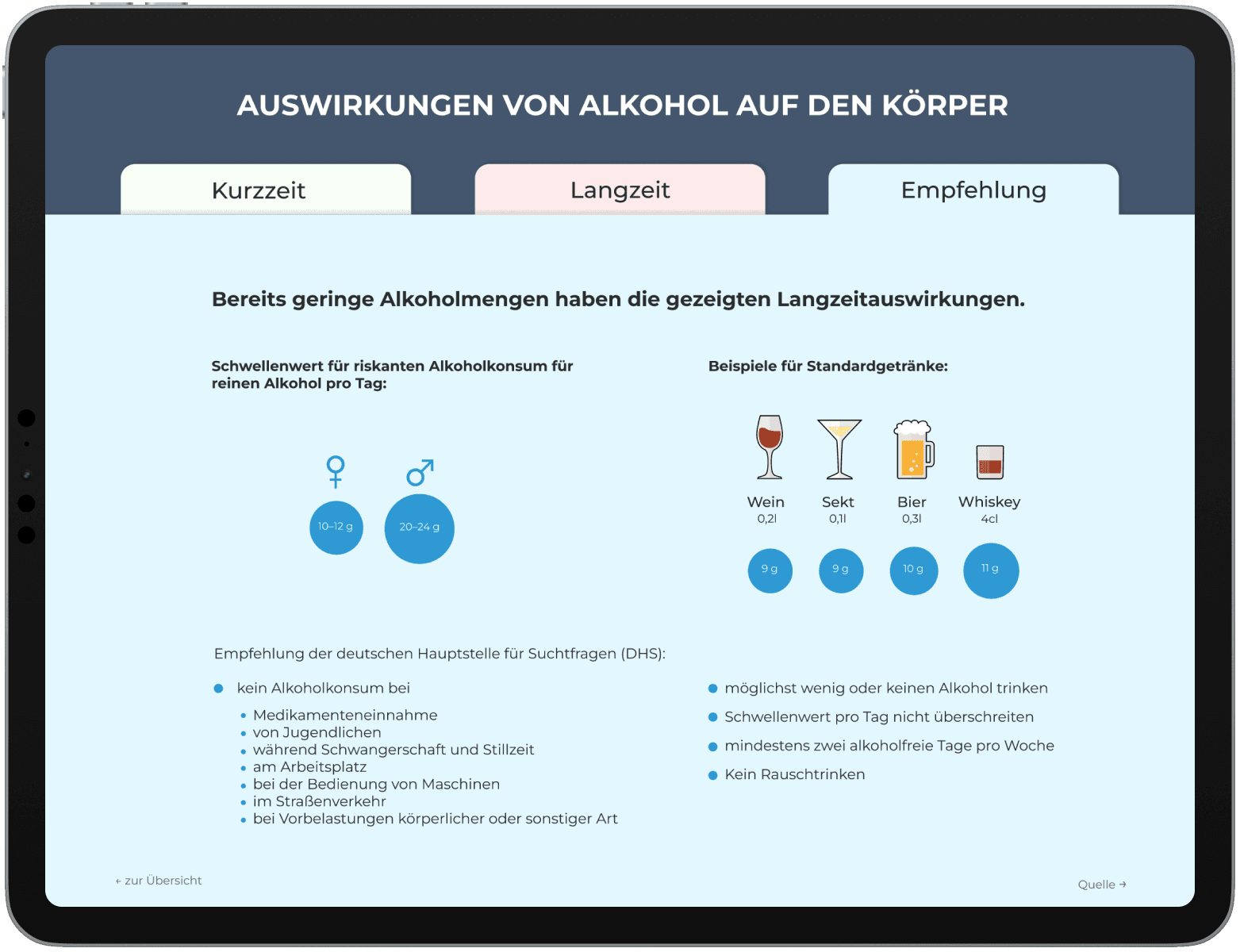 Im Abschnitt „Empfehlung“ werden die zuvor vermittelten Informationen in konkrete Richtwerte überführt. Der Schwellenwert für riskanten Alkoholkonsum wird visuell einer Auswahl gängiger Standardgetränke gegenübergestellt. Durch die optische Verbindung gleicher Datenkategorien können Nutzer:innen ihren eigenen Konsum schnell einordnen und die abstrakten Mengenangaben besser nachvollziehen. Der Bereich dient damit der praktischen Orientierung und übersetzt komplexe Gesundheitsdaten in verständliche, handlungsleitende Empfehlungen.