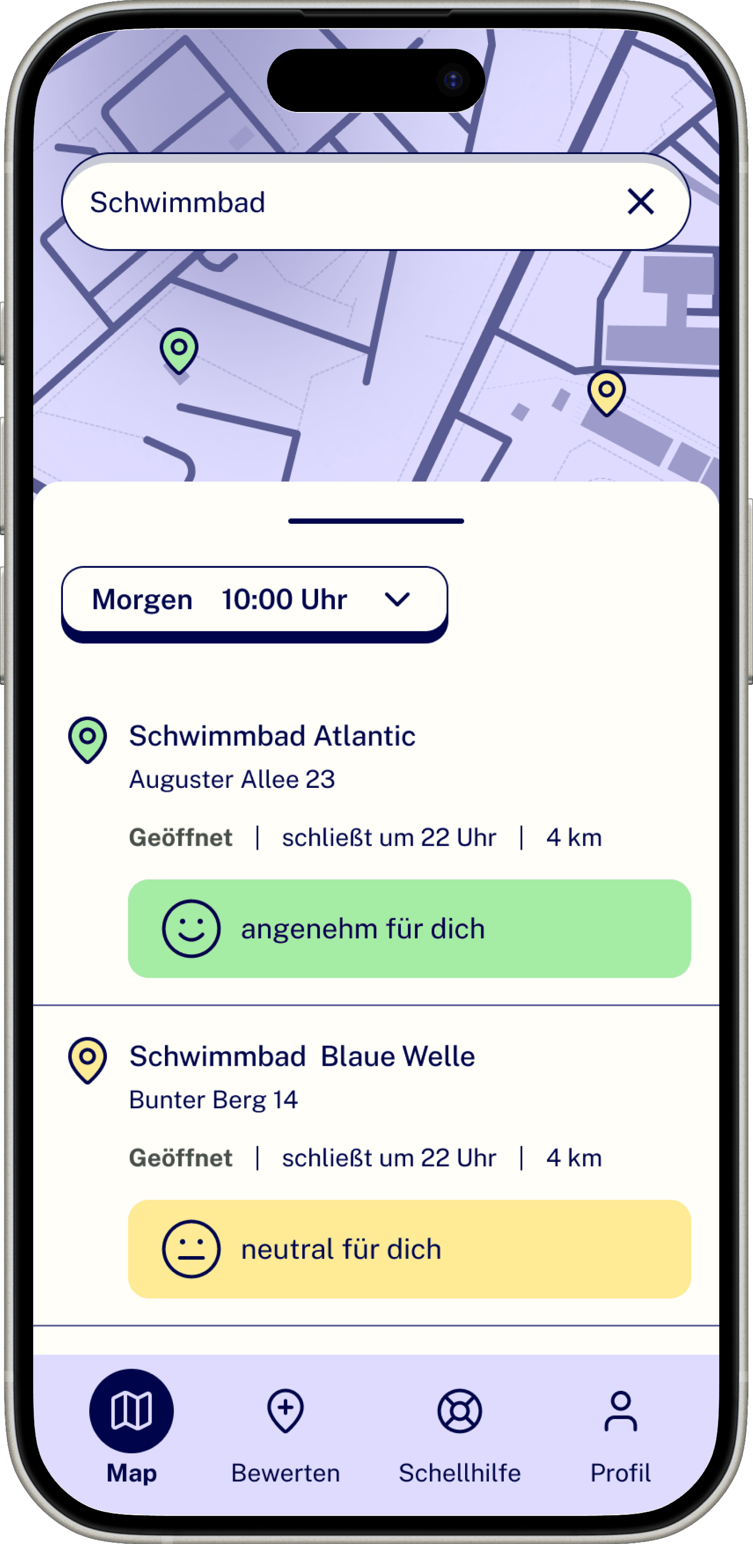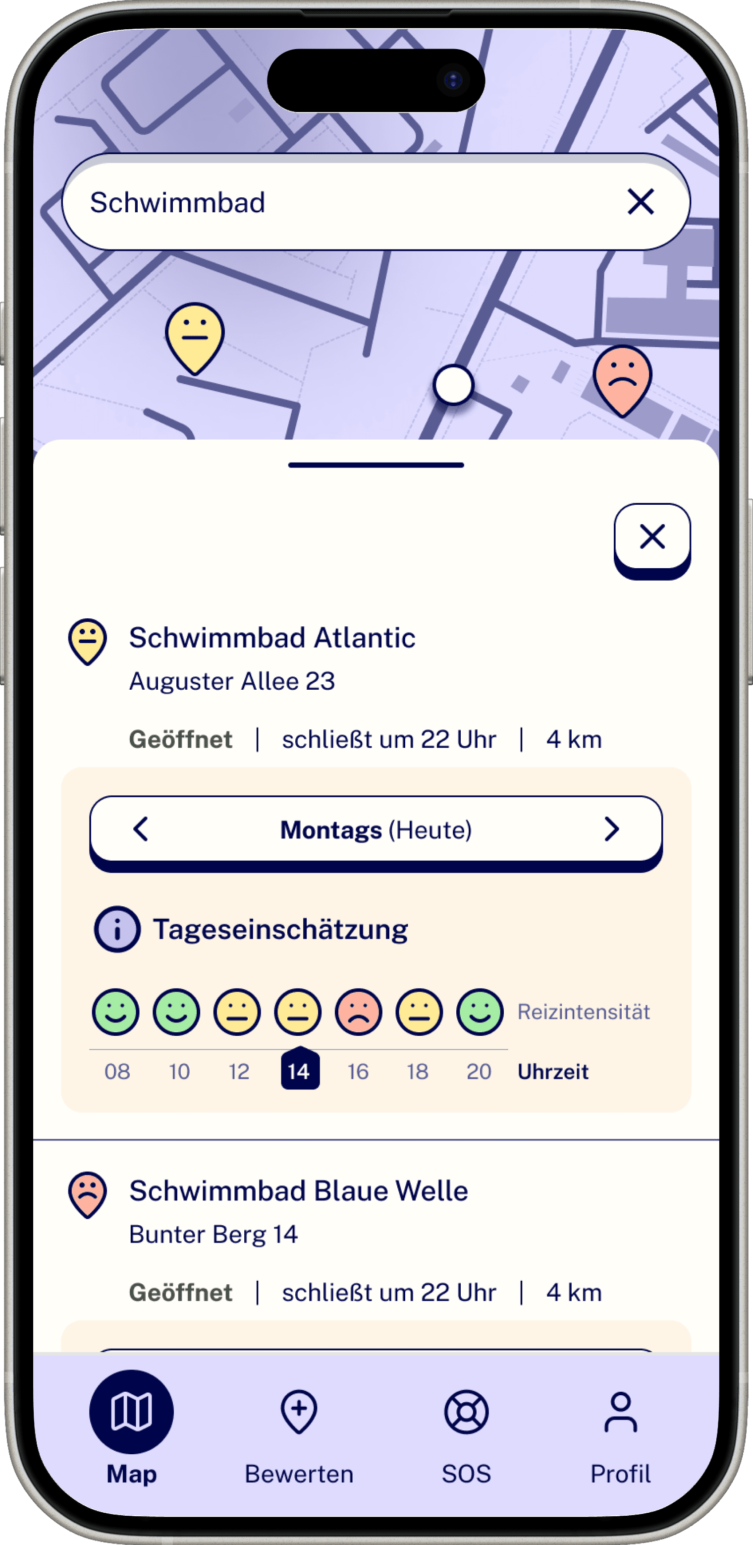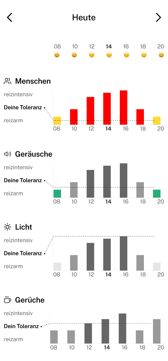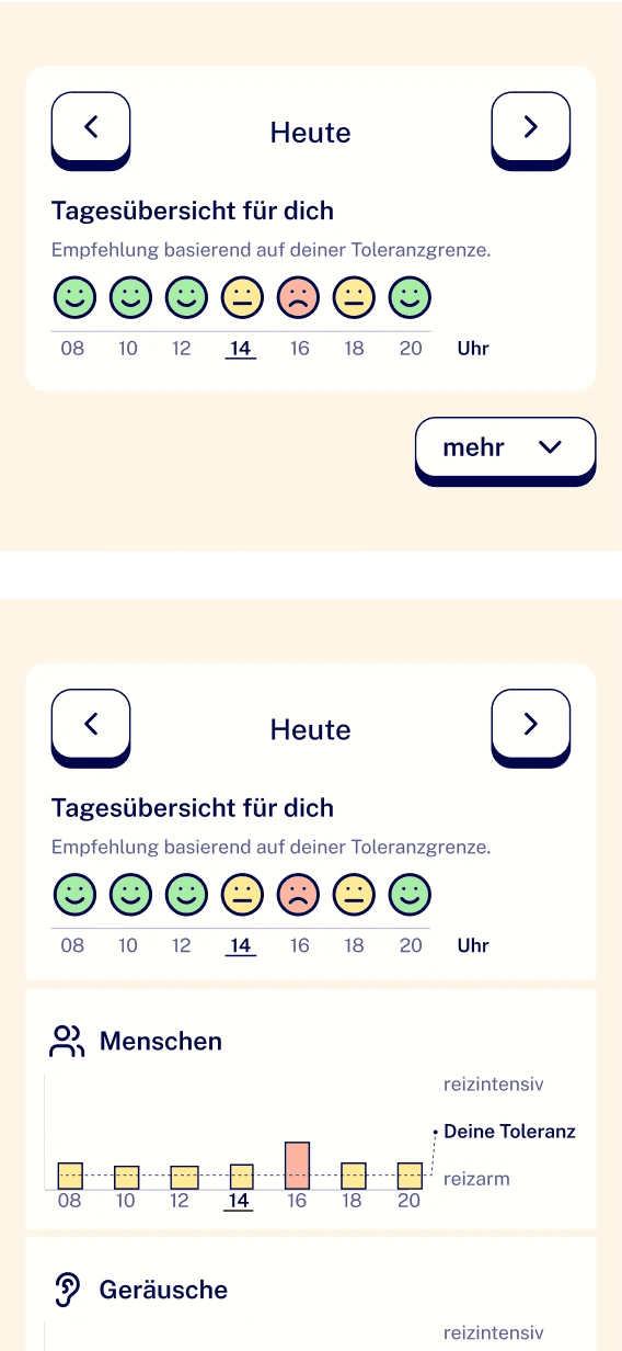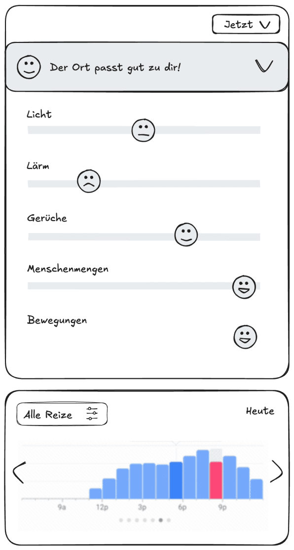 Der Prototyp wurde in moderierten Usability-Tests mit zwei Nutzerinnen evaluiert – einer stark reizsensiblen, neurodivergenten und einer reizsensiblen, introvertierten Person. Auf Basis des Feedbacks nahmen wir u. a. Anpassungen in der Ortsansicht vor. Die als bevormundend empfundenen Badges wurden ersetzt: Das Diagramm zeigt jetzt die Reizintensität des Ortes über den Tag, sodass Nutzer die Informationen selbstbestimmter filtern können.