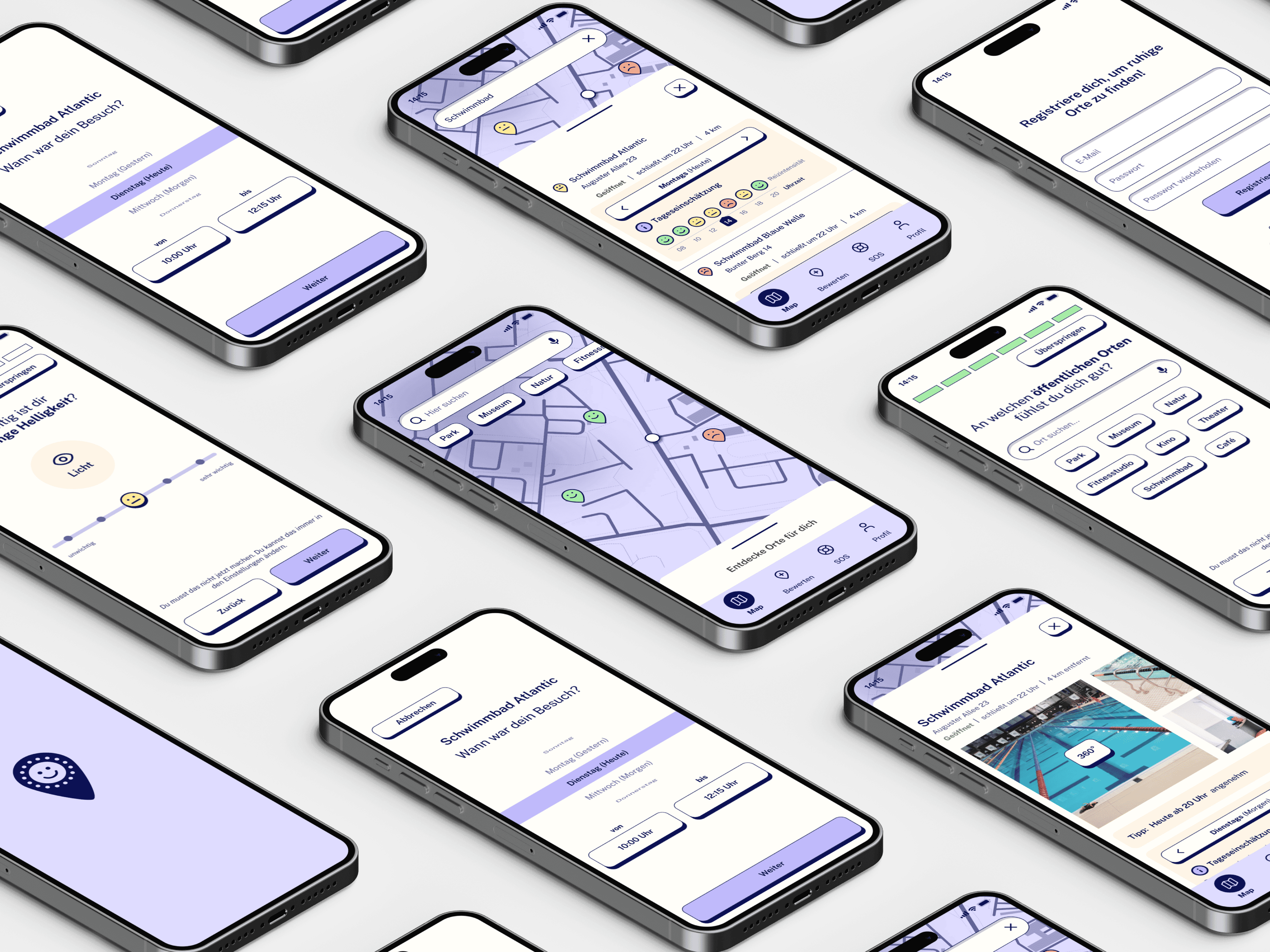 In diesem Projekt geht es um die Entwicklung eines App-Konzepts, das Menschen mit unterschiedlicher Reizempfindlichkeit (Autismus- und ADHS-Spektrum) dabei unterstützt, ruhigere und angenehmere Orte in ihrer Umgebung zu finden, um sensorische Überforderung im Alltag zu reduzieren und gesellschaftliche Teilhabe zu verbessern. Dieses Projekt entstand als Abschlussprojekt meiner UX/UI-Weiterbildung bei neue fische gemeinsam mit zwei weiteren UX/UI-Designerinnen, Hanna und Maria.
