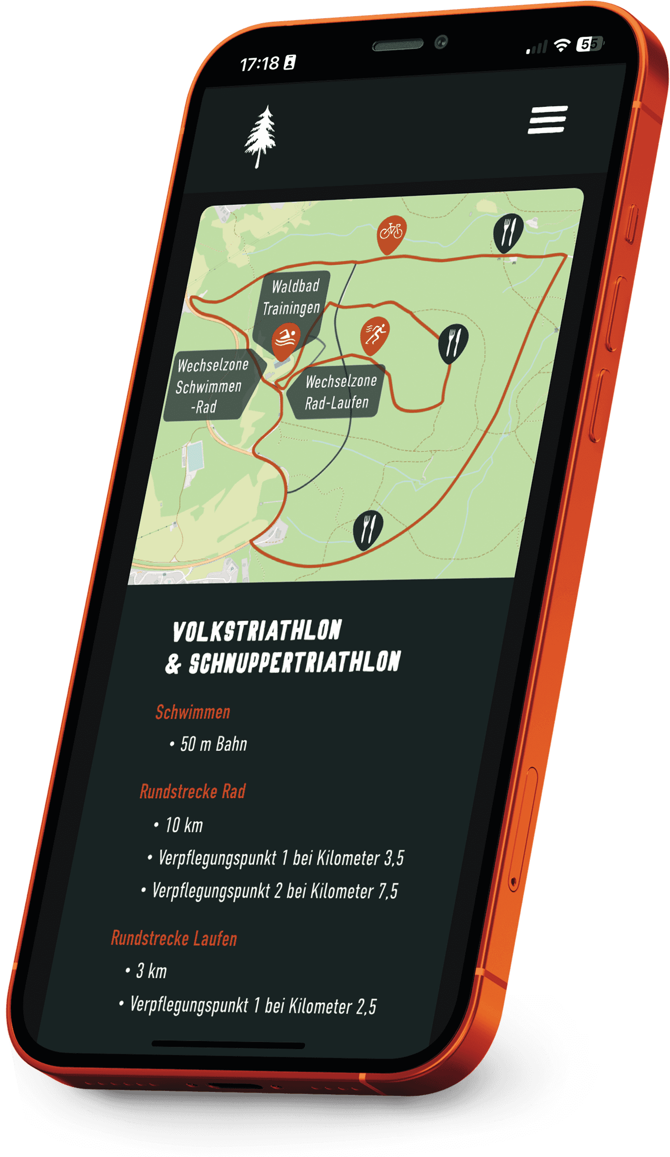 Für den SV Trainingen habe ich eine responsive Microsite konzipiert, gestaltet und technisch umgesetzt, um den Waldtriathlon klar zu erklären, emotional zu inszenieren und zur Teilnahme zu motivieren. Der Fokus lag auf einer scrollbasierten Onepager-Struktur, konsistenter Markenwirkung (Logo-Farbraum und Typografie), eigenentwickelten Icons sowie einer interaktiven Karte zur verständlichen Darstellung der Strecken.