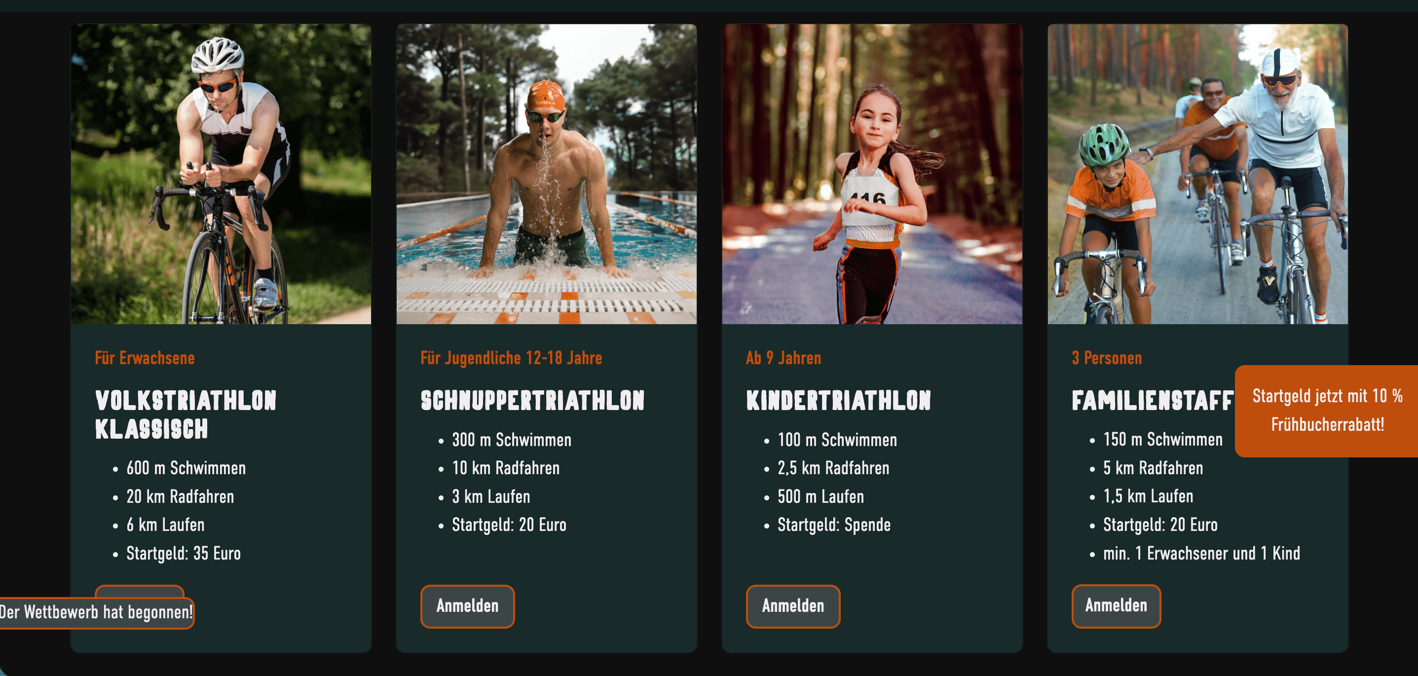 Die Wettkämpfe sind als übersichtliche Karten dargestellt. Jede Karte enthält die wichtigsten Informationen sowie einen direkten Anmelde-CTA, der automatisch zum Formular scrollt. Dadurch werden unnötige Navigationsschritte reduziert.