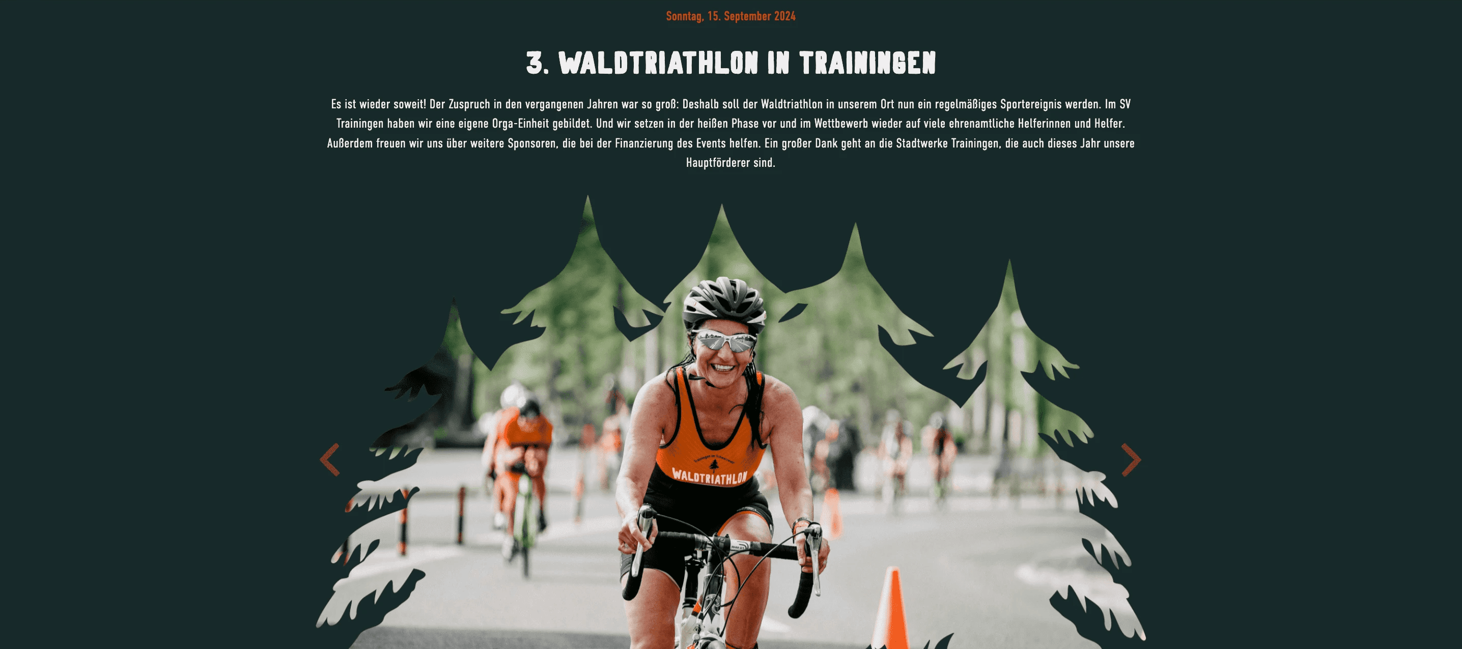 Für den SV Trainingen habe ich eine responsive Microsite konzipiert, gestaltet und technisch umgesetzt, um den Waldtriathlon emotional zu inszenieren und zur Teilnahme zu motivieren. Der Fokus lag auf einer scrollbasierten Onepager-Struktur, konsistenter Markenwirkung, eigenentwickelten Icons sowie einer interaktiven Karte zur verständlichen Darstellung der Strecken.